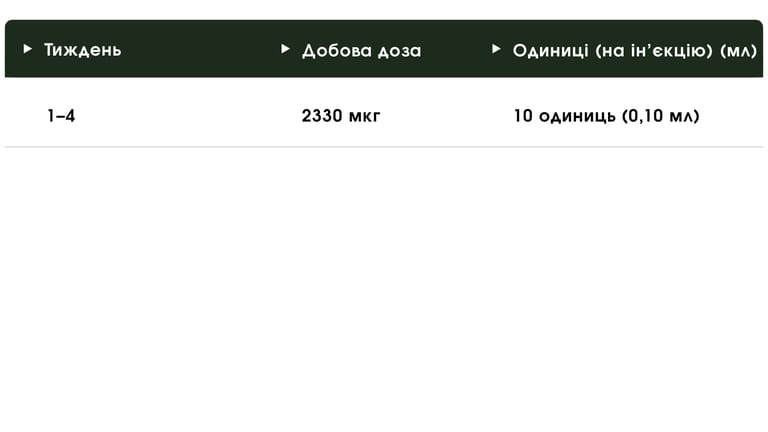 Добова доза: 2330 мкг (10 одиниць / 0,10 мл) протягом всього 4-тижневого циклу.