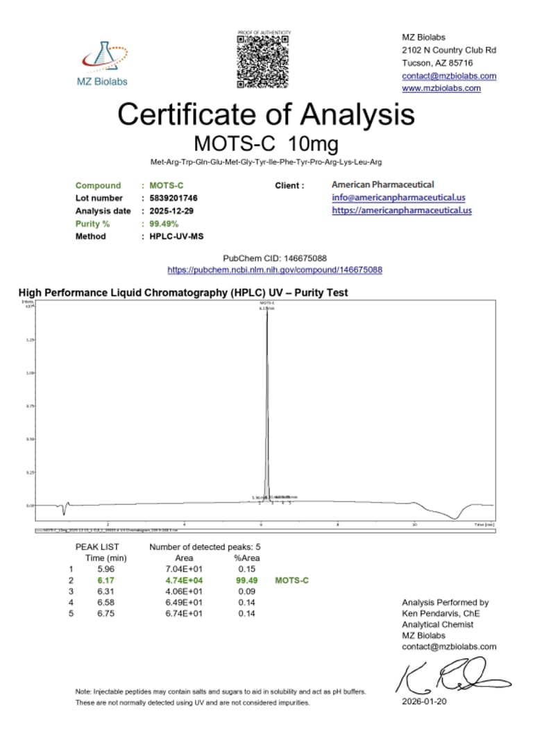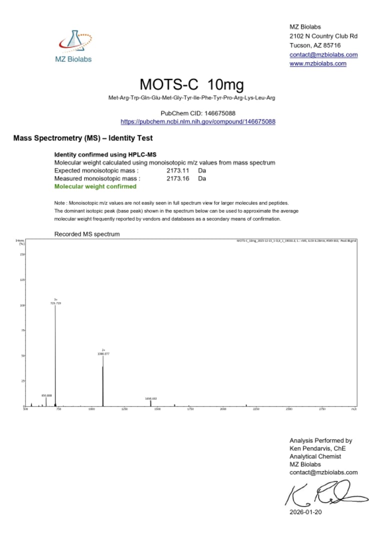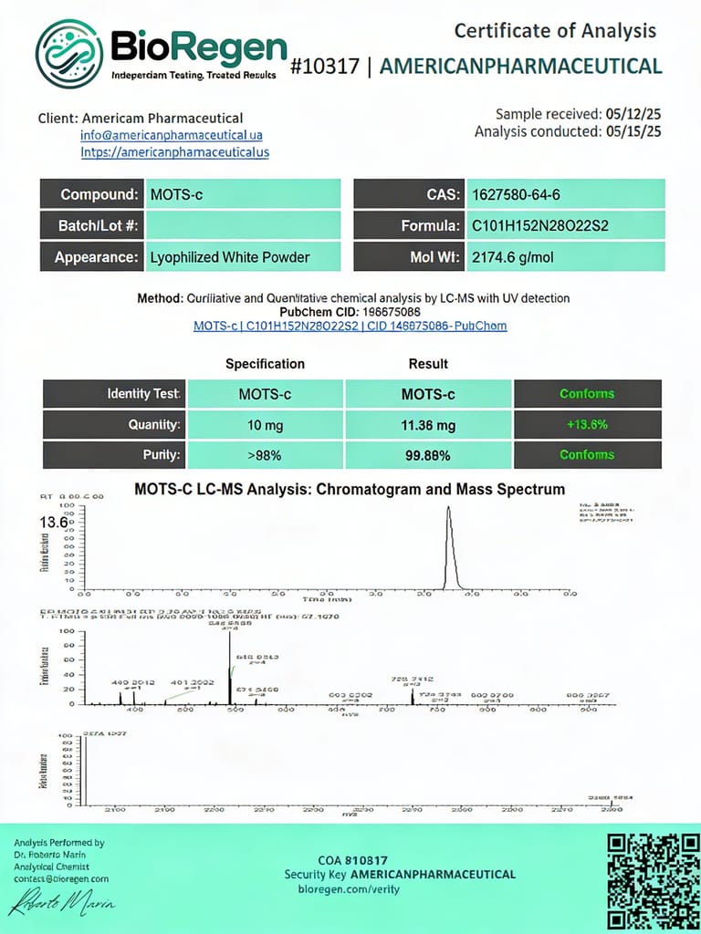 MOTS-c — це пептид із 16 амінокислот, що природно кодується мітохондріальною ДНК. Він покращує роботу мітохондрій, нормалізує обмін речовин та інсулінову чутливість, а також ефективно бореться з хронічним запаленням та окислювальним стресом.